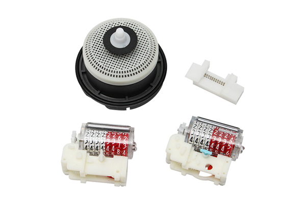 活塞式水表機芯由計數機構及計量機構組成,其中計數機構由插銷、齒輪盒及計數器組成,而計量機構則由計量室、活塞轉子、隔板、襯套、撥叉及蓋板等幾個部件組成。